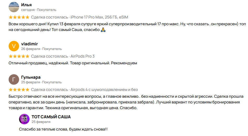 В профиле Авито проект Tot Samy Sasha имеет высокий рейтинг 5,0 на основании нескольких тысяч отзывов. Положительные комментарии содержат стандартные формулировки: