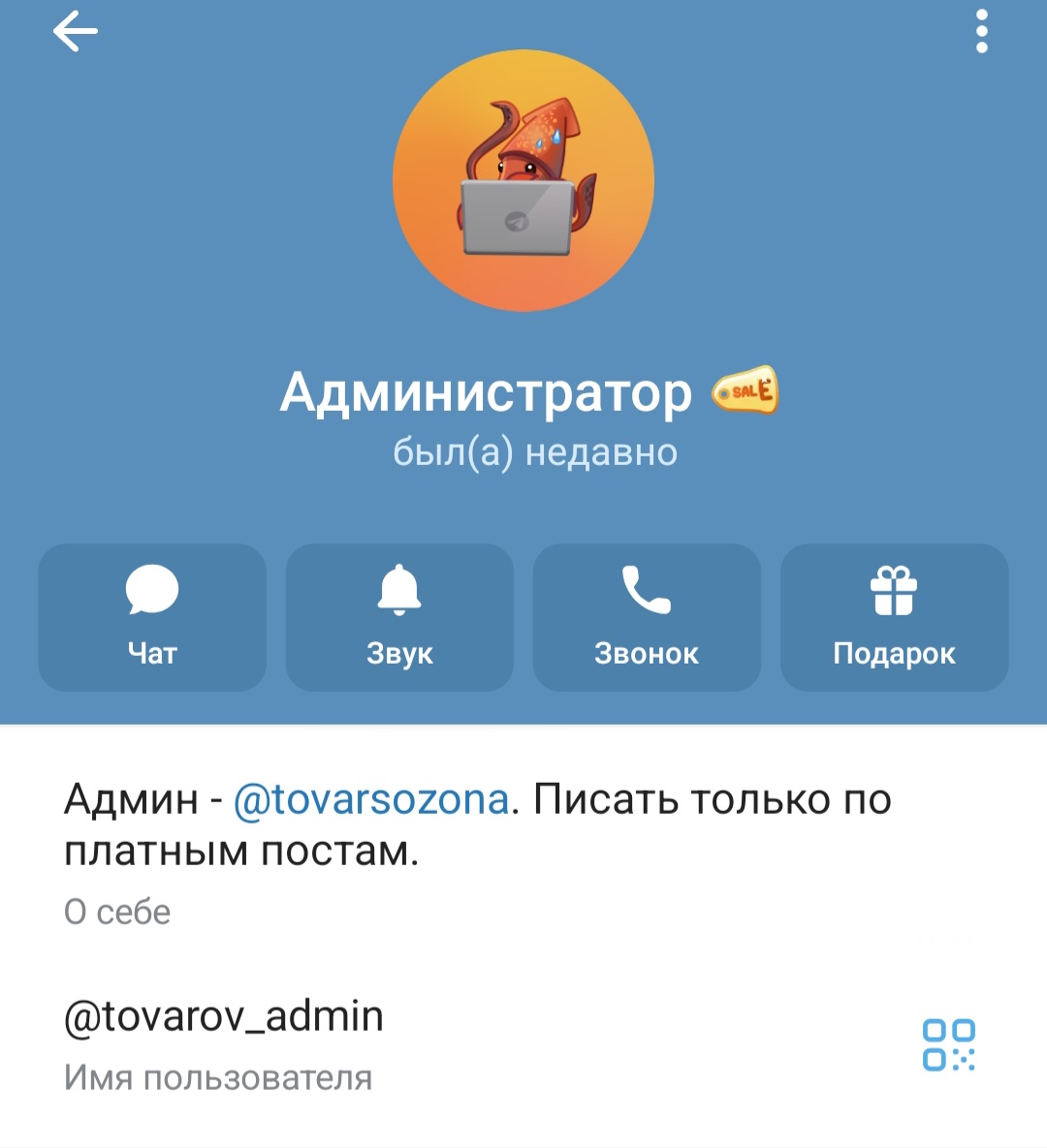 Канал в ТГ “Товары за отзывы” ведет некий Администратор. Он зарегистрирован в мессенджере под ником tovarov admin. Свое имя и фамилию, лицо он скрывает. Ничего о себе не рассказывает. Писать предлагает только по платным вопросам.