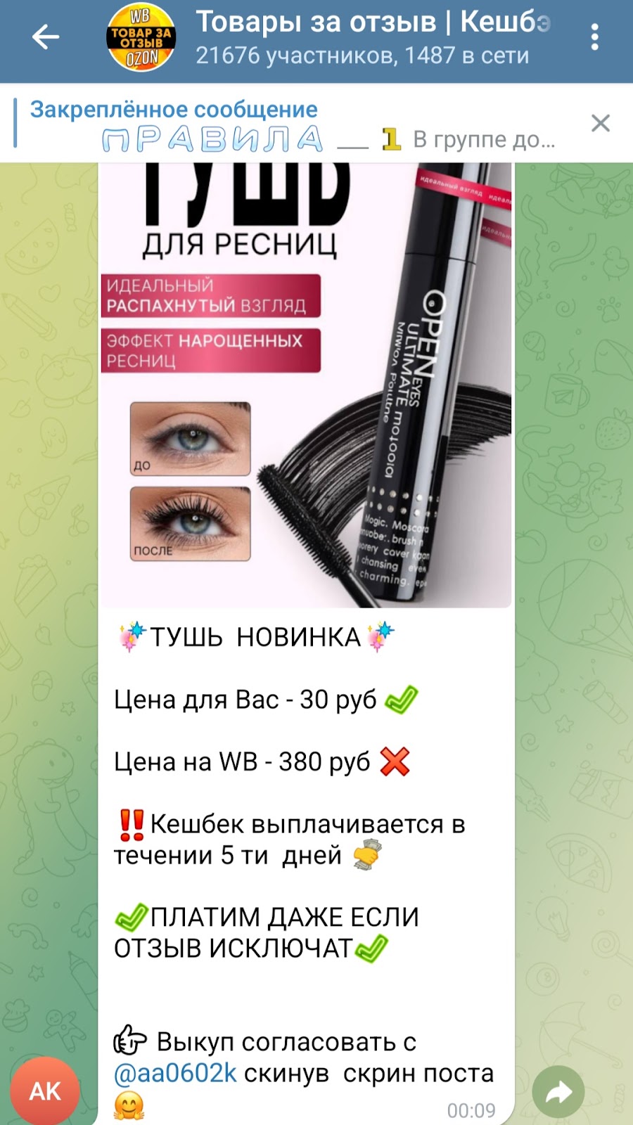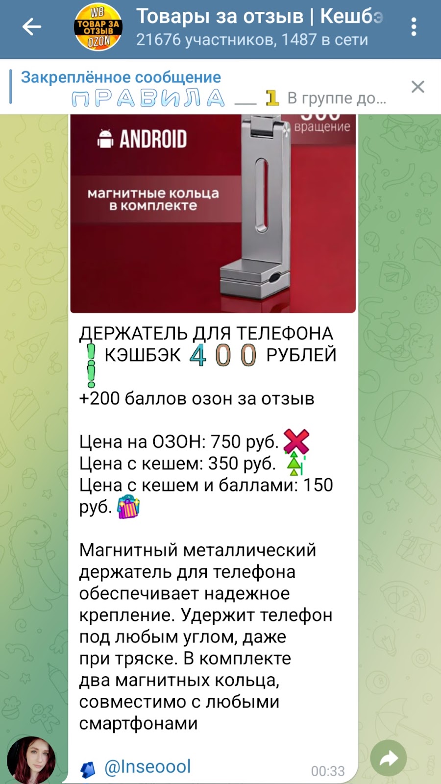 ТГ канал “Товары за отзыв” ведется с целью заработка на рекламе. Якобы объединяет представителей маркетов Wildberries и Ozon. Предлагает потенциальным покупателям крупные скидки и бесплатные товары. Прежде чем участвовать в этом проекте, рекомендуем принять во внимание следующее: