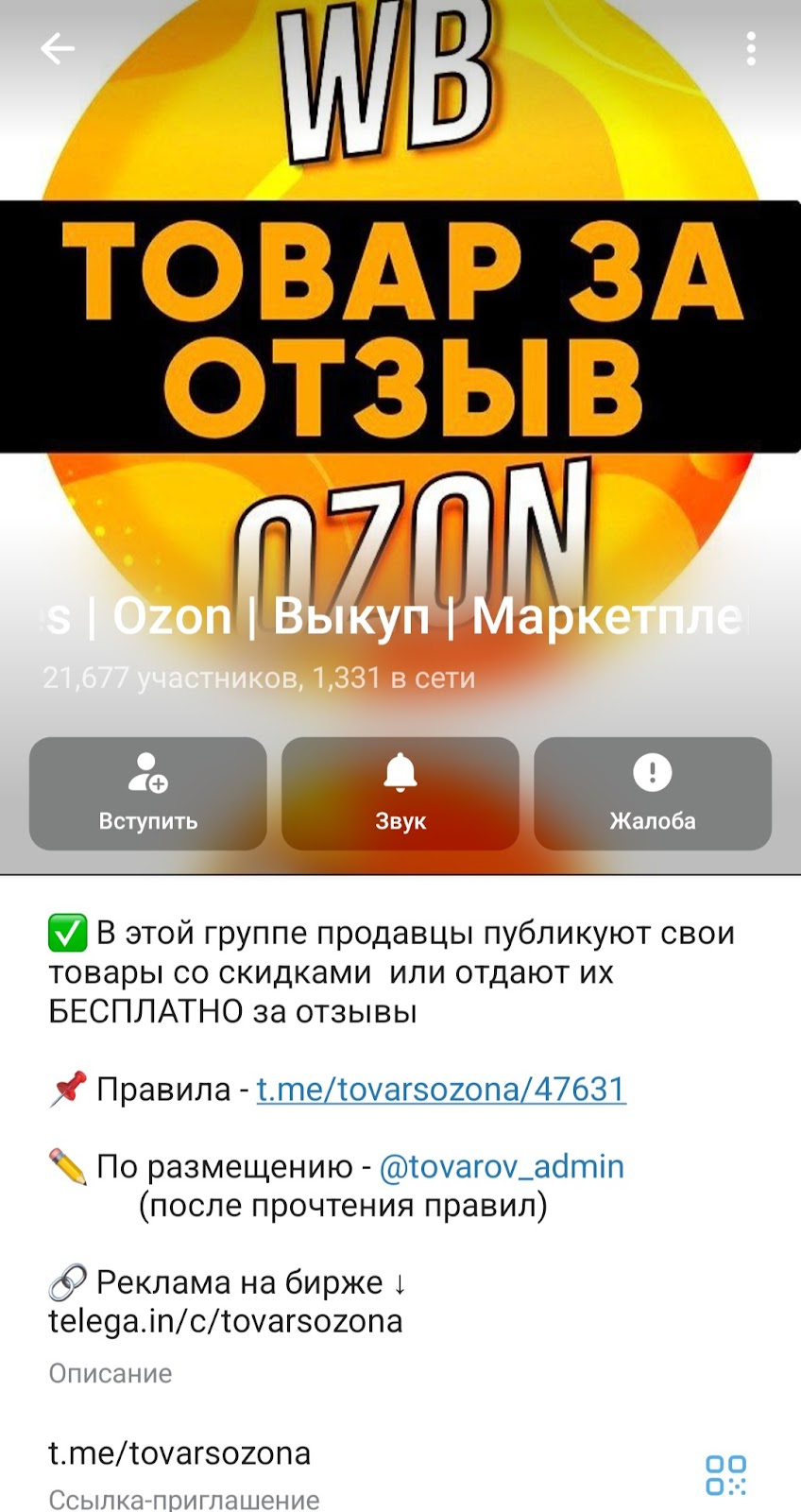 Телеграм канал “Товары за отзыв Кешбэк Халява Wildberries Ozon Выкуп Маркетплейсы Товар за отзывы Кэшбэк” был создан 31 мая 2022 года, но активно вестись начал со 2 июня. Зарегистрирован под юзернеймом tovarsozona. Целью его создания было заявлено бесплатное размещение рекламы предпринимателей Wildberries и Ozon. Потенциальным покупателям обещают товары с крупными скидками или даже бесплатное получение в обмен на положительный отзыв.