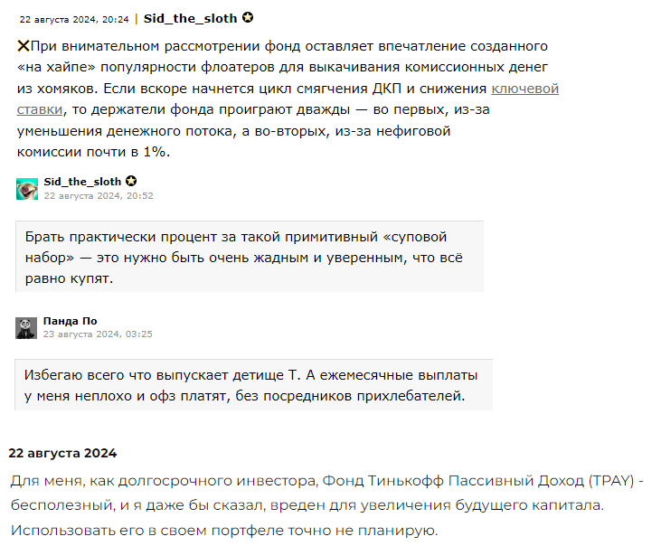 В публичном поле встречаются разные мнения. В отзывах о том, как работает фонд «Пассивный доход» от «Тинькофф Инвестиции» пользователи на самом «Тпэй» пишут, что им нравится ежемесячный поток и отсутствие необходимости разбираться в деталях.