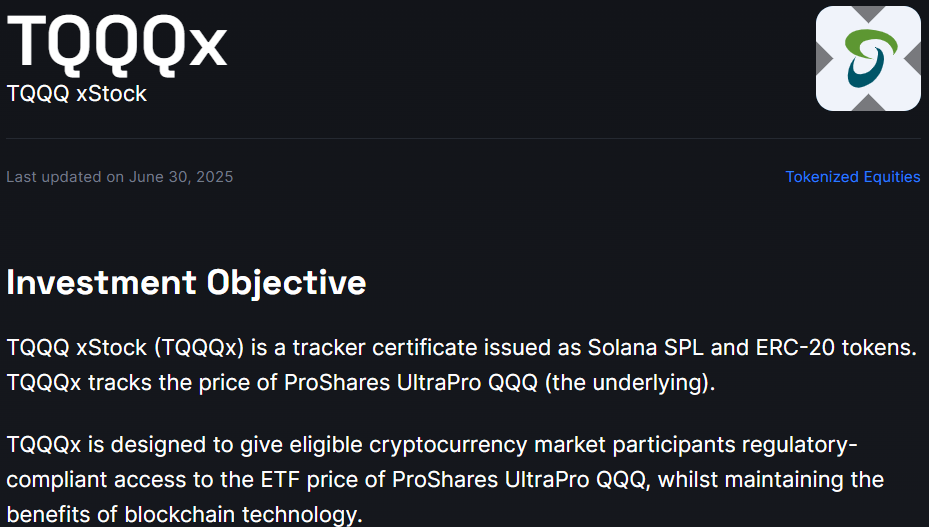 Tqqqx – это токенизированный актив на базе сети Solana, созданный для отслеживания динамики фонда ProShares Ultra Pro QQQ. Идея проекта заключается в том, чтобы предоставить держателям токенов возможность инвестировать в инструменты фондового рынка. При этом, у них не должно быть необходимости в покупке традиционных ETF через брокера. Кроме того, Ткккх не требует раскрытия личных данных. Формально это цифровой аналог фондового актива, однако фактическая связь с реальным ETF вызывает вопросы. Мы разберемся, Tqqqx – что это за крипта и стоит ли инвестировать в нее в расчете на прибыль.