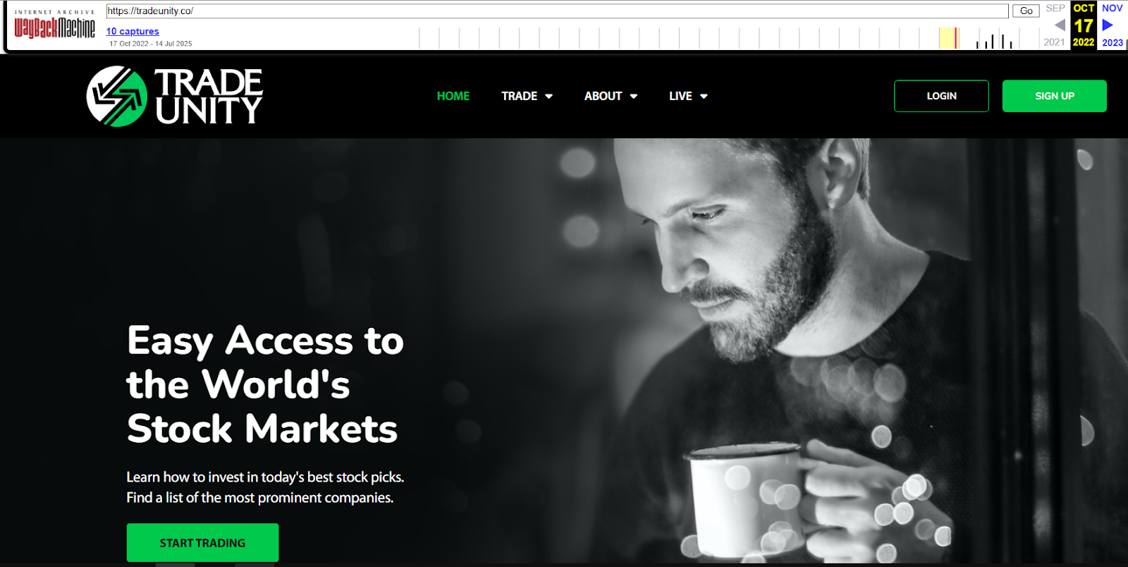 В отзывах о Trade Unit пишут, что это брокер, но проверка на Web Archive показала снимки только за 2022 год, значит, можно предположить, что сайт TradeUnity co не работает достаточно давно. Для просмотра доступна только главная страница, поэтому документы прочитать нельзя, а об условиях торговли ничего неизвестно.