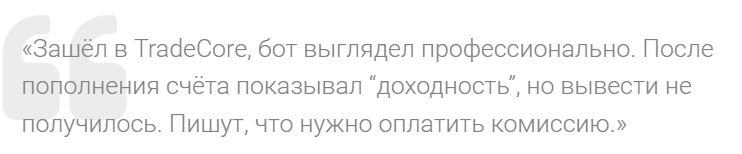 Суть данного проекта проясняют отзывы об инвестициях через приложение Tradecore. Один из клиентов отмечает, что бот показывал ему высокую «доходность», однако вывести деньги у него не вышло. Мошенники требовали за это «комиссию».
