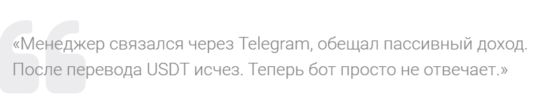 Следующий трейдер в своем отзыве о«Трейдкор» рассказывает похожую историю. Ему написал в Телеграм «менеджер», который обещал пассивный доход. Но как только инвестор перевел ему на криптокошелек USDT, мошенник пропал со связи.