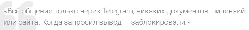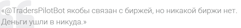- Клиенты в своих отзывах раскрывают нехитрую схему обмана. Как только трейдер «пополнял счет» для торговли через бота, мошенники забирали деньги себе и блокировали жертву.