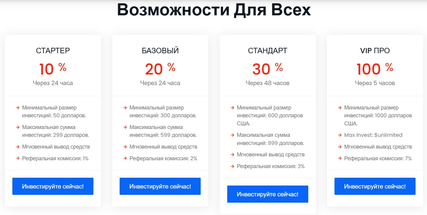 - VIP Pro — 100% каждые 5 часов, пополнение от 1000$