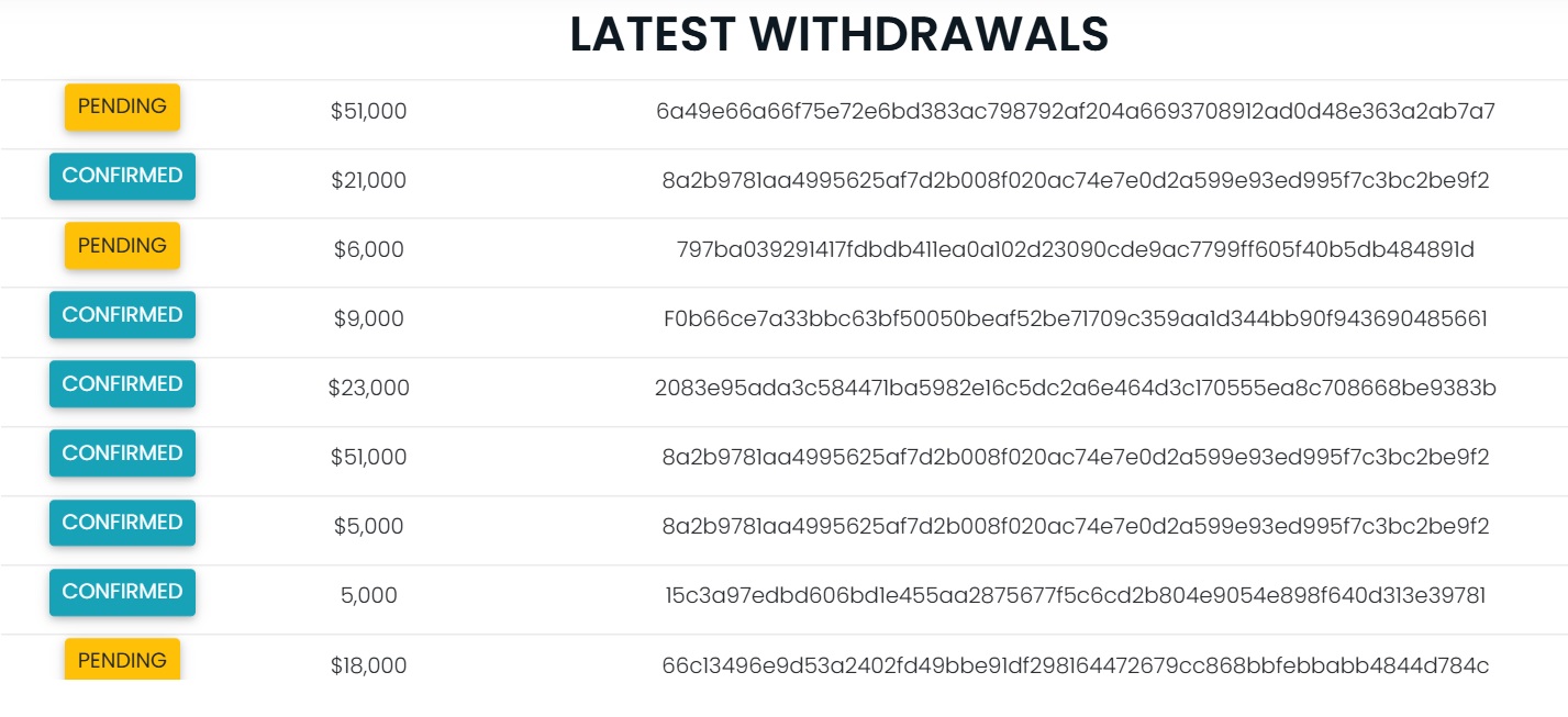 Пополнение и вывод финансов возможен через криптокошельки (Bitcoin, Ethereum, Litecoin, Dash, Bitcoin Cash), а также Perfect Money, Payeer. Минималка на вывод — 50 долларов. Обещают мгновенные транзакции, как подтверждение, демонстрируют специальные отчеты по выплатам, но они бездоказательны.