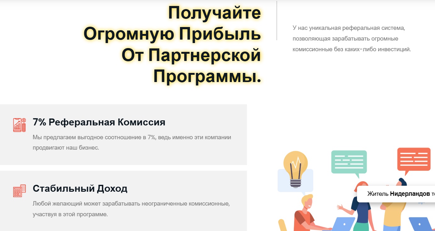 Отдельный упор разработчики сделали на партнерскую программу. Они активно продвигают идею заработка без инвестиций за счет привлечения участников. Заявленные комиссии зависят от тарифных планов — от 1% на Стандантере, до 7% на ВИП ПРО.