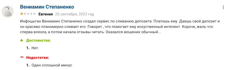 Но есть и совершенно противоположные отзывы о «Клубе Трейдеров». В них пользователи называли трейдера инфоцыганом. Якобы некий Вениамин Степаненко предлагал увеличить депозит. Указывали, что в работе ему помогал ИИ. Пользователи называли его мошенником, так как он только забирал деньги, но ничего не выплачивал.