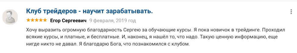 По некоторым отзывам, «Клуб Трейдеров» помогал пользователям зарабатывать на трейдинге. Якобы его обучающие курсы предоставляют реальную поддержку в этой сфере. По словам пользователей, в них представлена ценная информация, помогающая зарабатывать. С ее помощью якобы можно добиться финансовой стабильности. Необходимо учитывать, что аналогичные комментарии могут быть купленными.