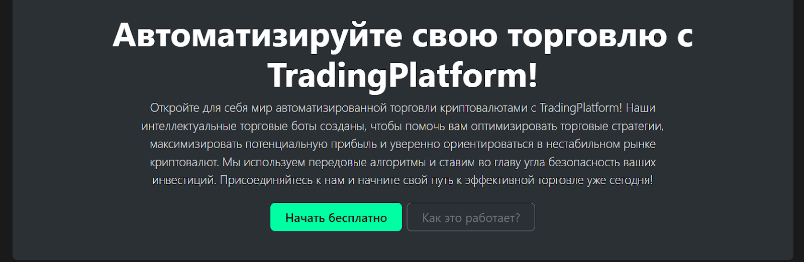 Как вывести деньги с Trading Platform и узнать другие подробности работы с инвестиционной платформой можно на сайте проекта. Авторы проекта обещают своим клиентам большую безопасность при инвестициях, якобы пользователи могут не беспокоится за свои вложения. Как сообщают создатели, автоматические процессы делают торговлю простой и удобной, хотя и не уточняют, за счет чего.