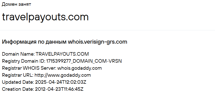 Сайт TravelPayOutsGlobal был зарегистрирован в доменной зоне .com в 2012 году. Последние обновления датированы апрелем 2025 года. Сама компания уточняет дату старта работы в 2011 году.