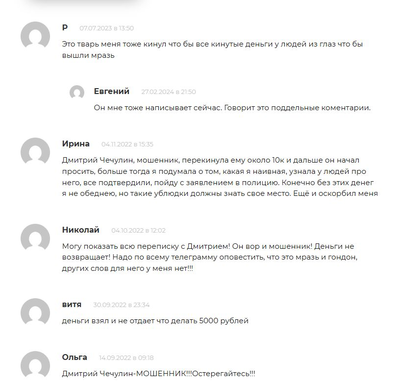 На независимых сайтах можно встретить только негативные комментарии. Пользователи массово обвиняют Дмитрия Чечулина, рассказывают, что потеряли с ним деньги и не могут их вернуть.
