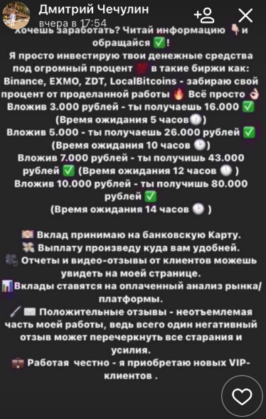Дмитрий утверждал, что он умеет зарабатывать на пампе криптовалют. Якобы, у трейдера есть отличная схема, которая позволяет ему получать минимум х10 к первоначальному депозиту за несколько часов. Вот так выглядели посты в сторис.