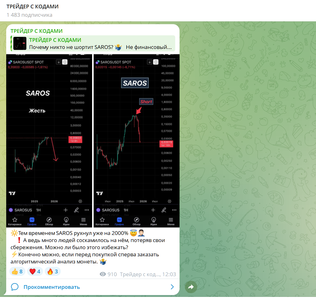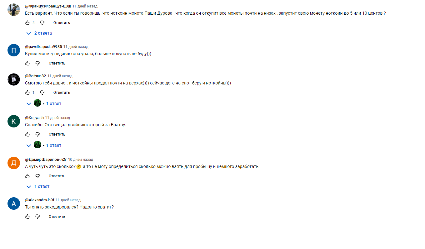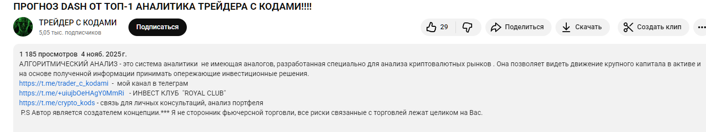 В каждом видео автор рекламирует свою систему аналитики, прогнозы по отдельным монетам, предсказывает пузыри, которые несут потенциальные риски для трейдеров. Цена услуг обсуждается с каждым индивидуально в закрытой переписке.