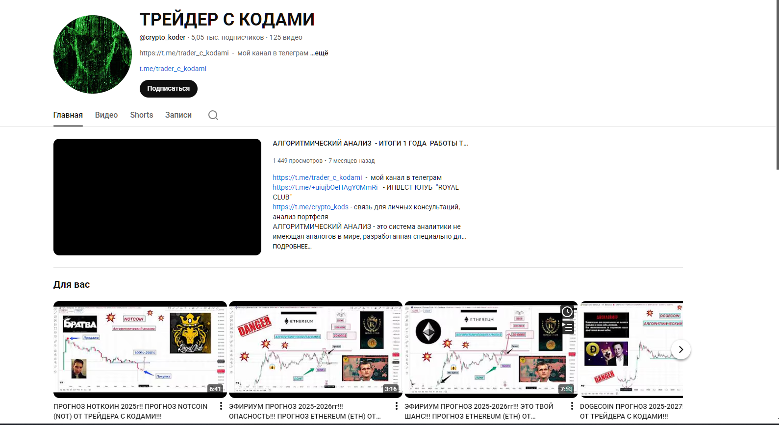 Кроме основного канала, на который подписано 1483 человека, автор ведет проект на YouTube. На площадку подписано более 5 000 трейдеров. Здесь размещено 125 видео прогнозов о движении цен основных криптовалют на длительный период с 2025 по 2027 год.