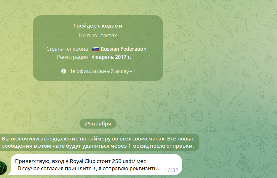 По запросу трейдер высылает приглашение в закрытое сообщество, стоимость участия 250 USDT в месяц.
