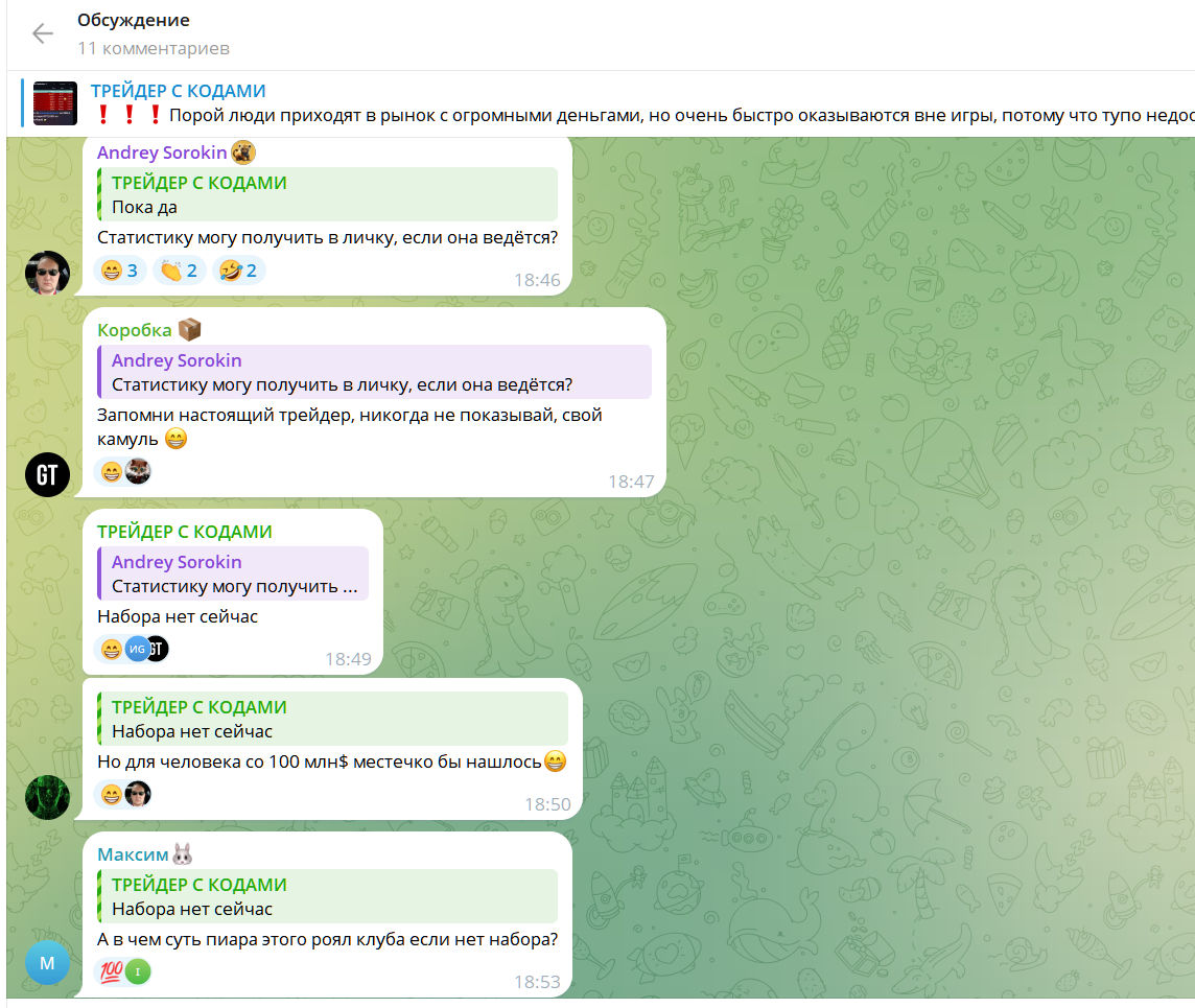Стоимость участия в закрытом сообществе открыто не разглашается, все вопросы по оплате решаются в закрытой переписке с «учителем». Насколько волновой анализ этого трейдера успешный понять сложно. Хотя комментарии под постами не закрыты, общаются подписчики между собой мало.