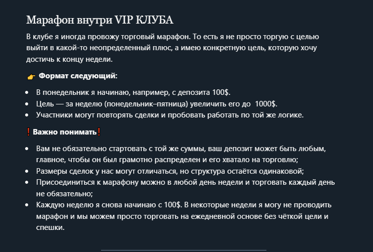 Также в закрытом клубе проводятся марафоны. Павел ставит определенную цель, например, увеличить за неделю депозит со 100 долларов до 1 000 долларов. Далее торгует, скидывает сигналы, и участники могут их копировать, или же применять свои стратегии.