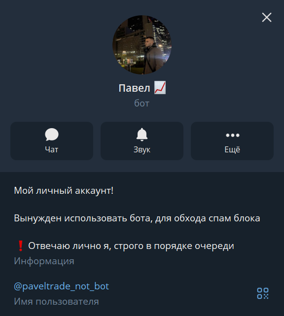 Связь с подписчиками поддерживает только через телеграм-бота – «Павел» (paveltrade not bot). Уверяет, что отвечает именно он, а не робот.