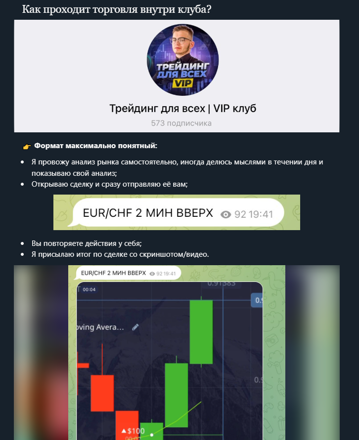 Павел создал канал «Трейдинг Для Всех Инвестиции», чтобы делиться полезной информацией в сфере трейдинга, показывать свои результаты торговли и рекламировать закрытый клуб. В приват-сообществе автор дает сигналы, чтобы участники повторяли его сделки и зарабатывали.