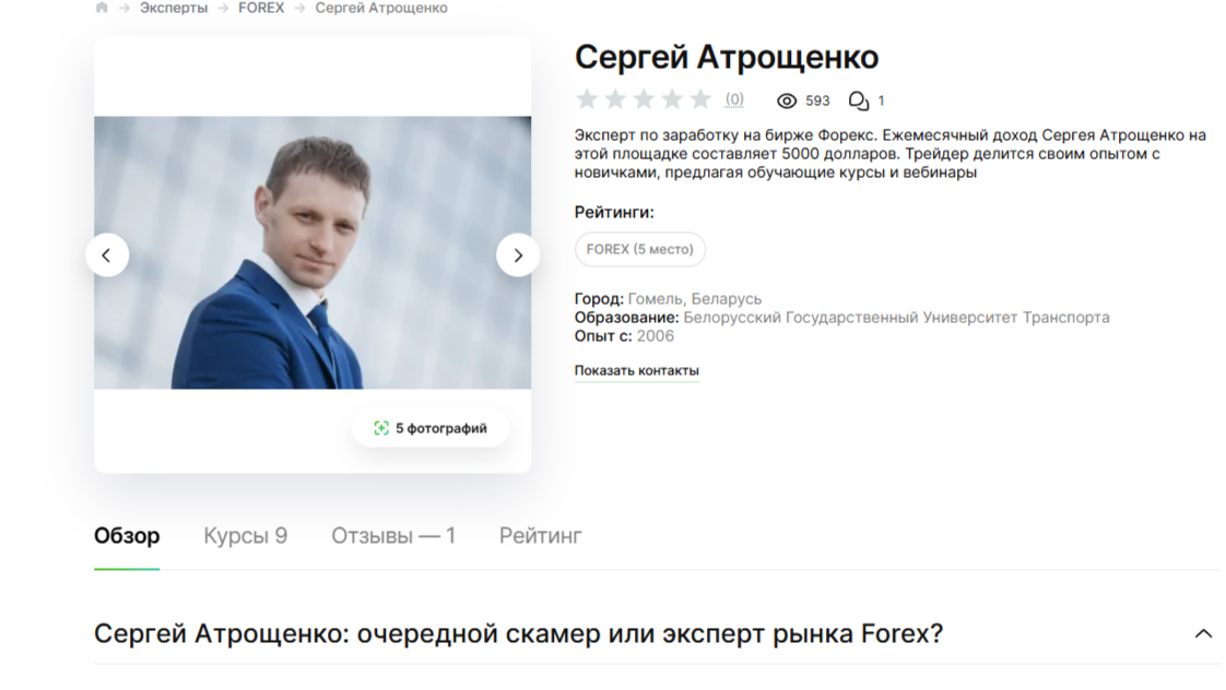 В процессе исследования деятельности Сергея Атрощенко нам не удалось найти подтверждений его складным рассказам. В свободном доступе нет информации об инвестиционном портфеле данного эксперта, верифицированной статистики сделок, официальных результатов учеников, лицензий на торговую деятельность и других профильных документов. Отсутствие реальных подтверждений намекает на инфоцыганство.