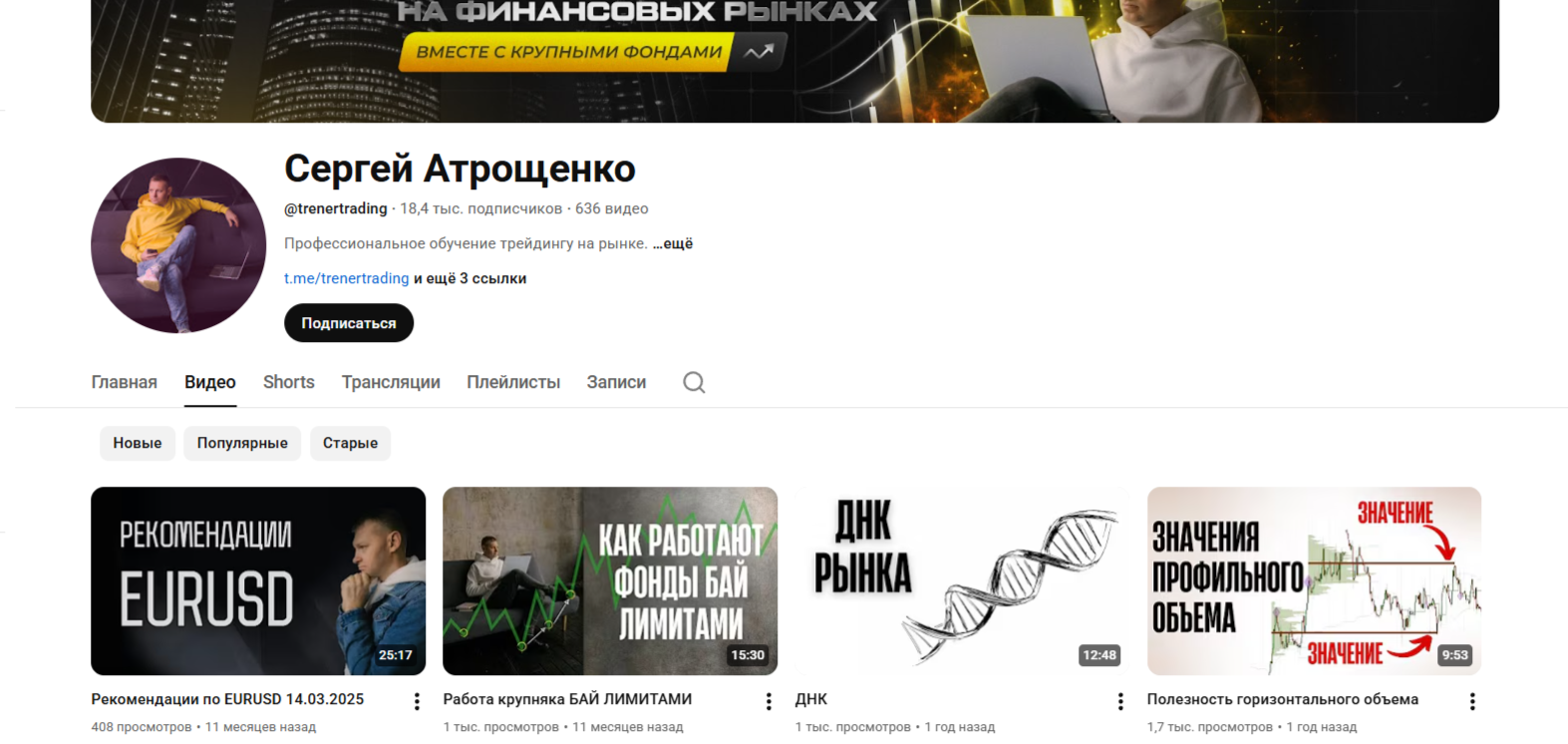 Группу «Трейдер Сергей Атрощенко» можно обнаружить в ВК. Есть проект данного автора на Ютубе. Канал был создан 12 декабря 2011 года. Он имеет 18 000+ подписчиков и 636 видео. В ленте ресурса представлены ролики о стратегиях и психологии в трейдинге. Редкие видео Сергея набирают до 7 000 просмотров. Обычно ролики интересны сотням подписчиков. Последнее видео на канале было опубликовано 11 месяцев назад.