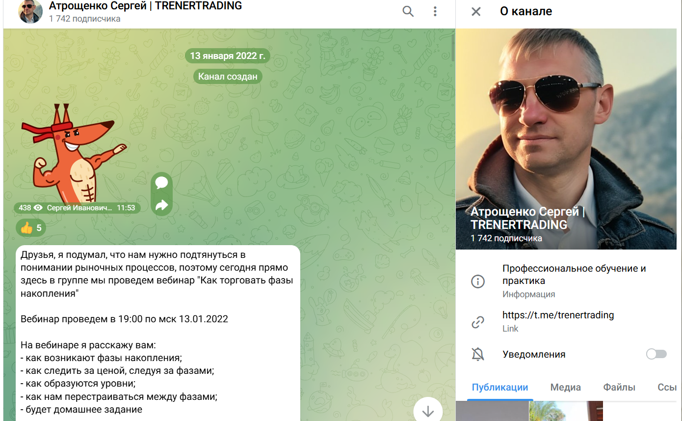 Канал «Атрощенко Сергей TRENERTRADING» представлен в Телеграме. Проект появился в мессенджере 13 января 2022 года. Ресурс имеет всего 1 700+ подписчиков. В ленте канала можно обнаружить обзоры активов с графиками и рекомендации по торгам. Контент интересен 56% аудитории. Достаточно неплохой результат.