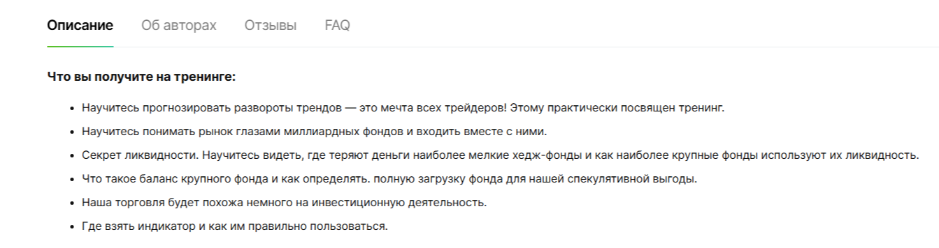 Курс «Тренинг по отчетам СОТ» – не лучший вариант для изучения азов трейдинга. Мы не обнаружили преимуществ в пятидневном обучении. Минусы программы следующие: