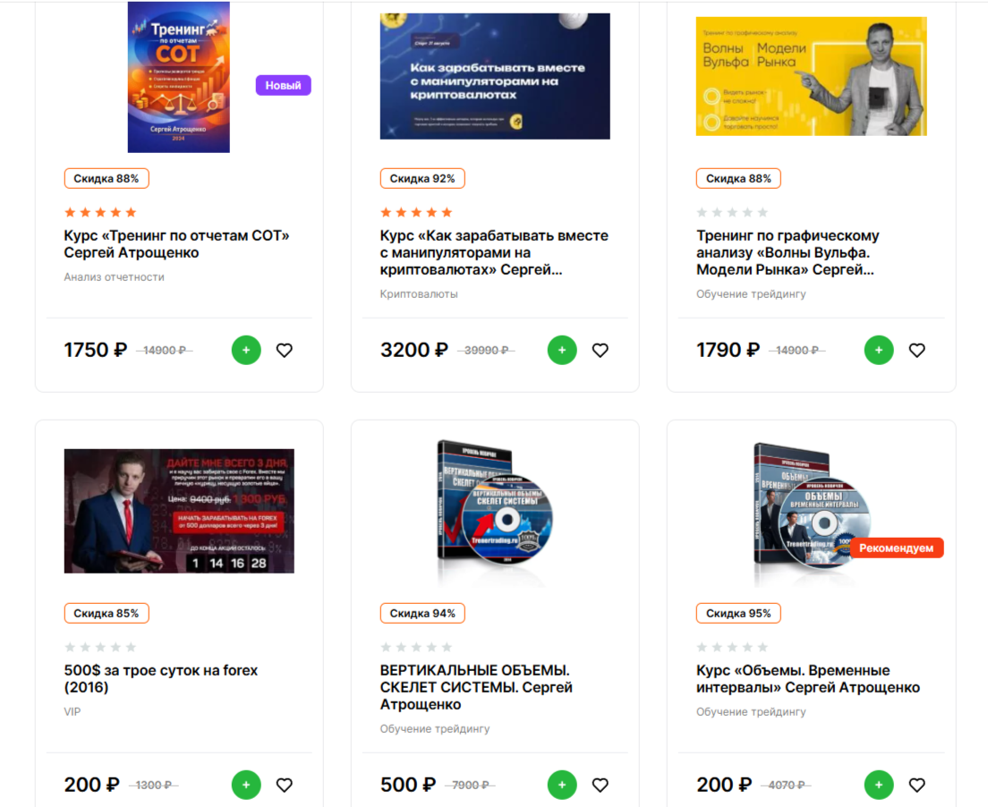 Портал traderfond ru предлагает целевой аудитории разные курсы Сергея Атрощенко. Купить любую программу можно онлайн. Для оплаты заказа можно использовать СБП, карты, WebMoney, ЮMoney и т. д.