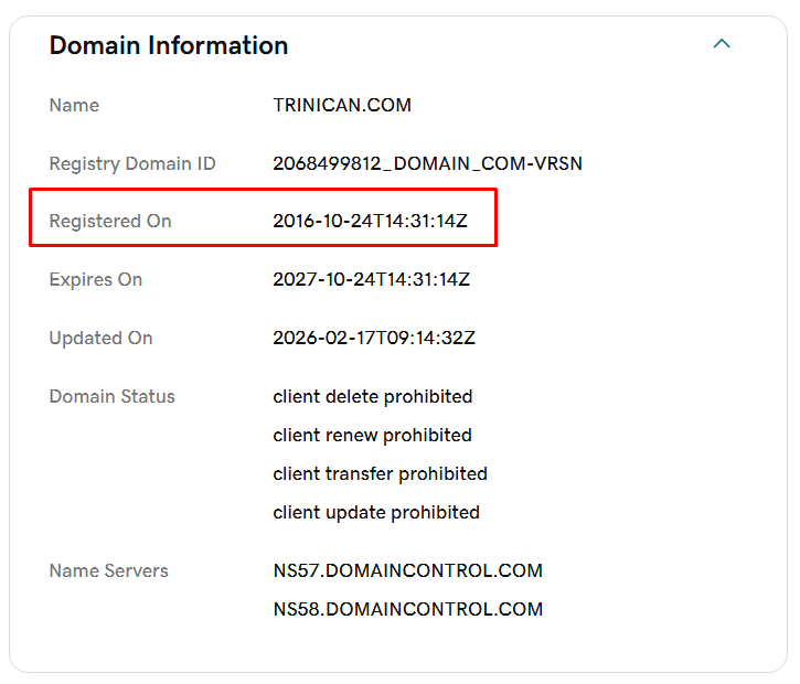 Мы также проверили WHOIS домена Trinican Com и выяснили, что он был зарегистрирован в 2016 году.