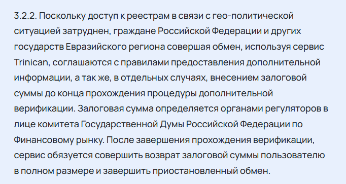 Мы изучили правила по использованию сервиса и нашли любопытный факт. В пункте 3.2.2 указано, что клиенты должны вносить залог для дополнительной верификации. При этом владельцы ссылаются на некий комитет Государственной Думы РФ по финансовому рынку. Это стандартная уловка аферистов. Данный госорган никак не регулирует деятельность криптобменников и оборот цифровых активов. И уж точно ни один регулятор не будет требовать деньги для верификации личности.