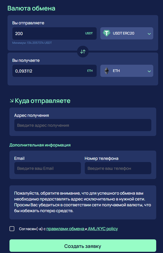 Регистрация не нужна. Заявку оформляют прямо на главной странице. Достаточно указать в форме реквизиты кошельков, электронную почту и номер телефона. Комиссия за обмен составляет 1% от суммы перевода.