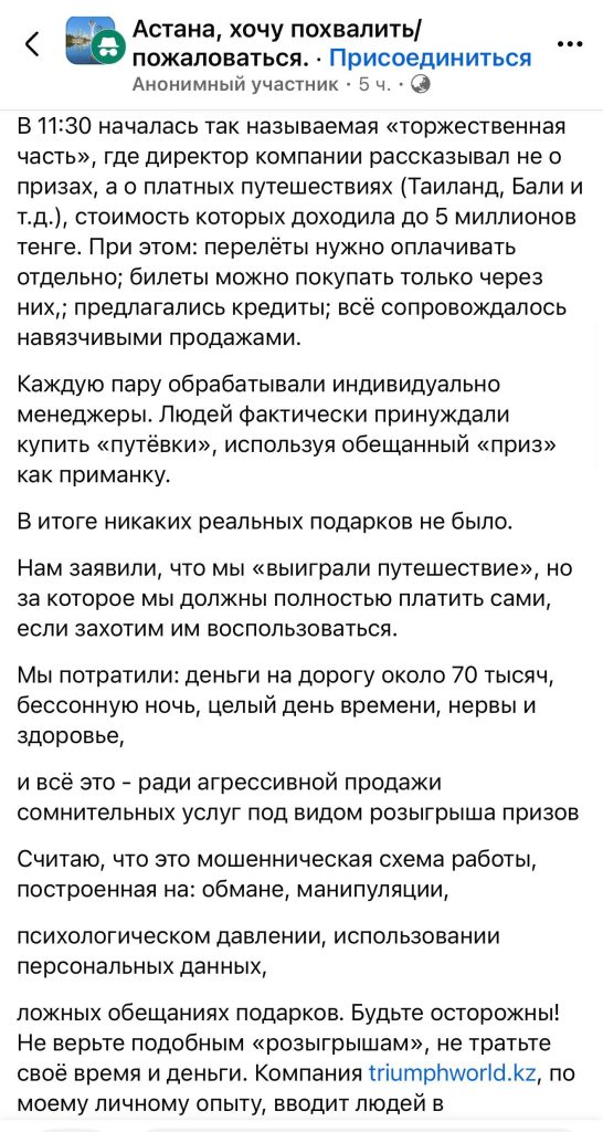 В сети появились жалобы на проект triumphworld kz, в которых говорится, что под предлогом получения призов пользователей завлекают на сомнительные конференции, на которых в агрессивной манере убеждают купить путевки, которые якобы являются этими самыми призами. В обзоре расскажем подробнее о деятельности проекта.