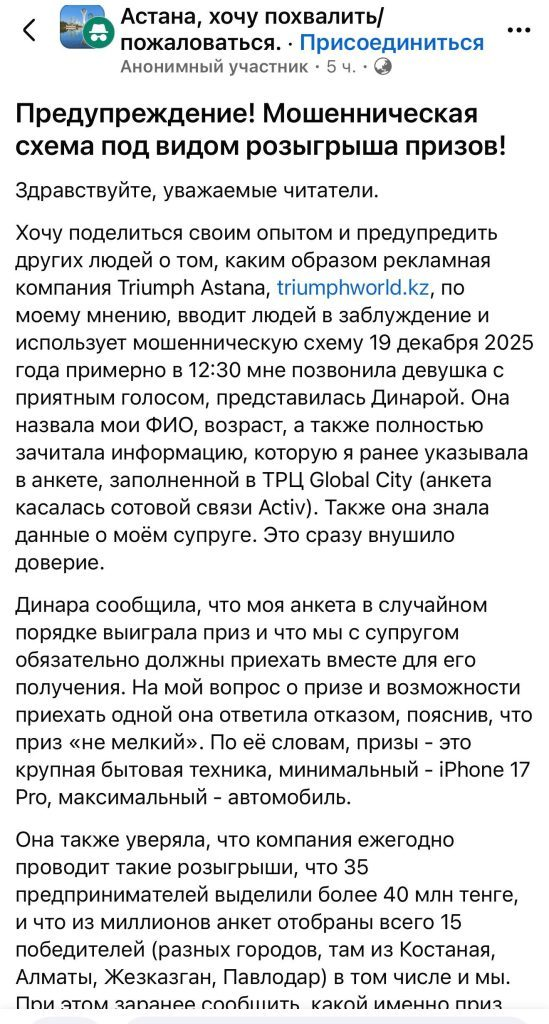 По всей видимости, контактные данные брались и слитых баз. По ним людям начали звонить и говорить о том, что они выиграли ценный приз. Якобы минимум, что можно было получить – iPhone 17 Pro, а максимум – автомобиль. Людям говорили, что некие 35 предпринимателей выделили 40+ миллионов тенге для проведения предновогоднего розыгрыша, который должен был состояться 20 декабря в Астане по адресу ул. Токпанова, 22, ЖК «Акбулак Премиум».