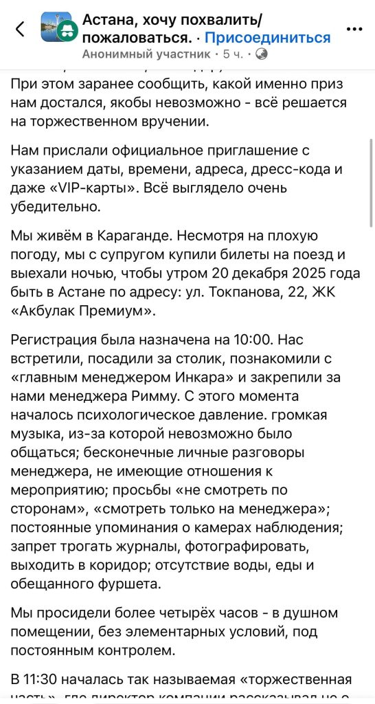 Но там уже не было ничего про розыгрыш. Некий представитель компании, который представился директором, рассказывал о том, что сейчас люди могут приобрести платные путешествия со скидкой. «Призы» у всех посетителей были просто скидки на путёвки, вот только их стоимость доходила до 5 миллионов тенге. Других обещанных ценных призов не было. Таким образом люди просто потеряли время, деньги (конкретно в имеющейся жалобе люди ехали из Караганды) и нервы.