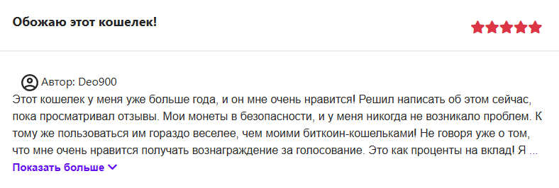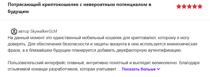 Для пользователя с ником SkywalkerGLM кошелек стал единственным местом, в безопасности которого он уверен. Отдельно владелец ЦФА похвалил удобный и понятный интерфейс, отзывчивость команды и поддержки.