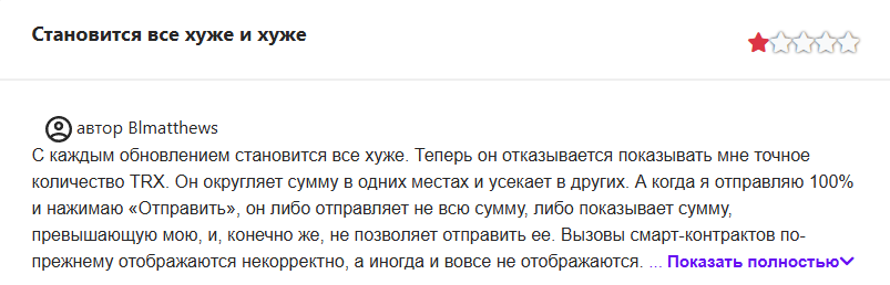 Юзер с ником Blmatthews говорит, что доступные функции в приложении Tron Wallet с каждым обновлением становятся только хуже, оно работает нестабильно. Отдельно он отметил странные алгоритмы, округляющие или урезающие переводимые токены на свое усмотрение.