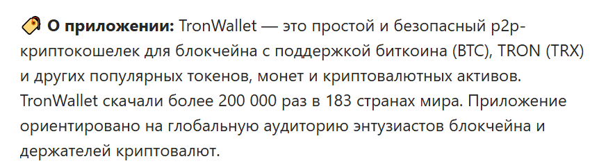 В одном из разоблачений проект называют простым и безопасным p2p-кошельком с поддержкой BTC, TRX, Ledger, прочих криптовалют. Мобильное приложение «Трон Валлет» якобы было скачано более 200 000 раз юзерами из 183 стран мира.
