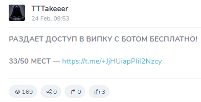 А анонимность разработчика методики профитной торговли и вовсе отрицательным образом сказывается на репутации проекта. Основатель тг-площадки Tttakeeer накручивает фолловеров и для расширения комьюнити использует нечестные способы. Активных пользователей в скам-паблике можно сосчитать по пальцам.