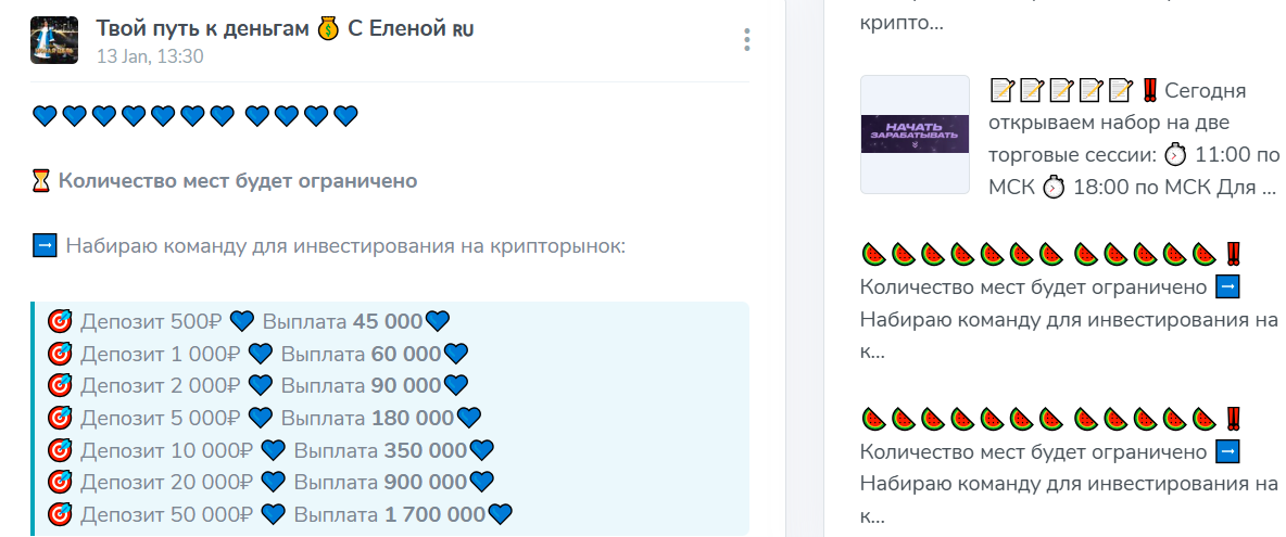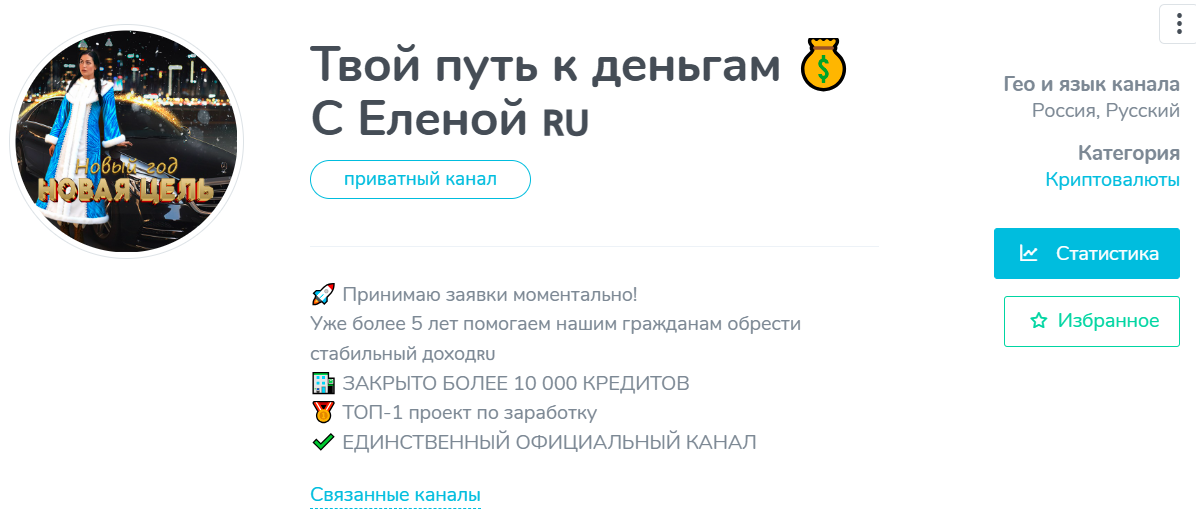 “Твой путь к деньгам с Еленой — телеграмм канал, не являющийся инвестиционным проектом, обучающей платформой или легальным сервисом. Это анонимная схема с агрессивным маркетингом, обещаниями нереальных для рынка доходов и полным отсутствием гарантий.