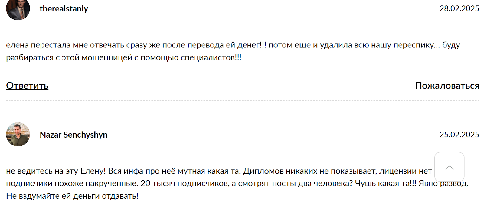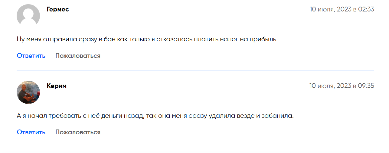 Люди пишут, что после перевода денег общение меняется или прекращается, при попытке задать вопросы о налогах или возврате средств аккаунты блокируются, переписки удаляются.