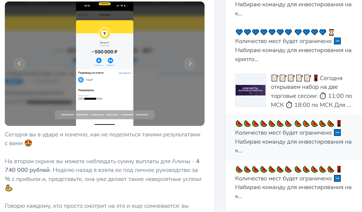 В подтверждение выкладываются скриншоты переводов, видео с отзывами, истории успеха людей, которые за пару дней якобы закрывают ипотеки, покупают машины и выходят на миллионные выплаты.