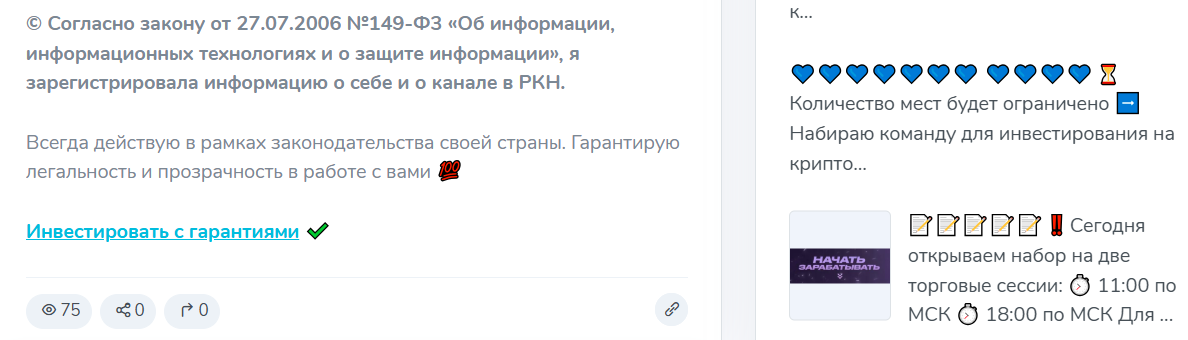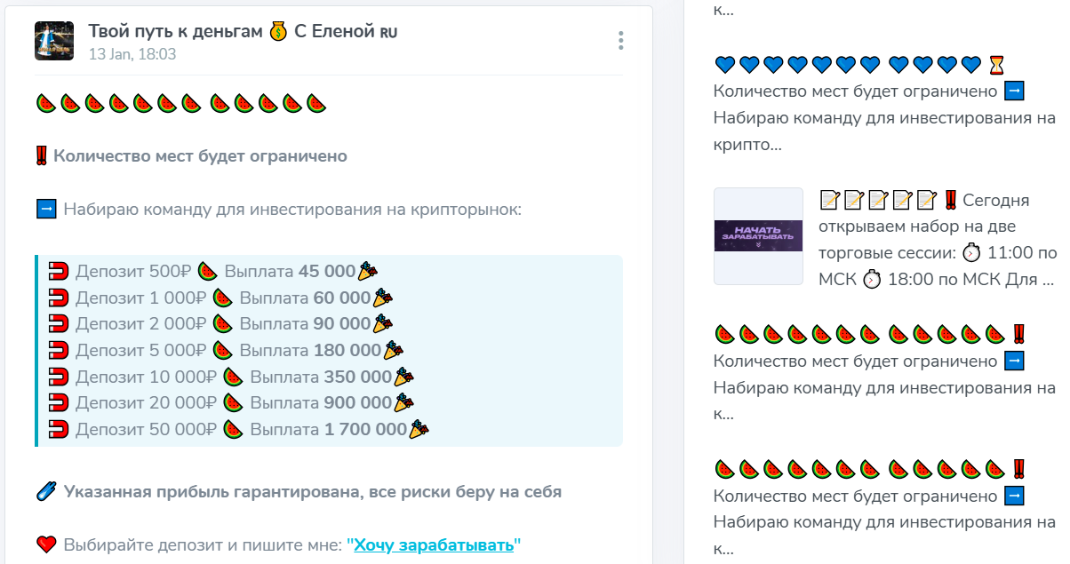Параллельно почти каждый день публикуются предложения вложиться в торговую сессию. Схема везде одинаковая: минимальный депозит от 500 рублей и обещанная выплата, которая в десятки и сотни раз превышает вклад уже через 15–24 часа.