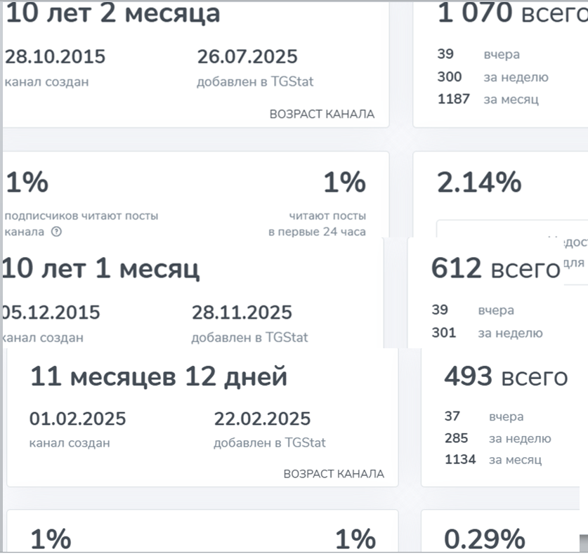 В TGStat видно, что у проекта существует несколько клонов с похожими названиями, одинаковым стилем и контентом, но разным возрастом. Некоторые из них действительно зарегистрированы более 10 лет назад, однако добавлены в статистику совсем недавно.
