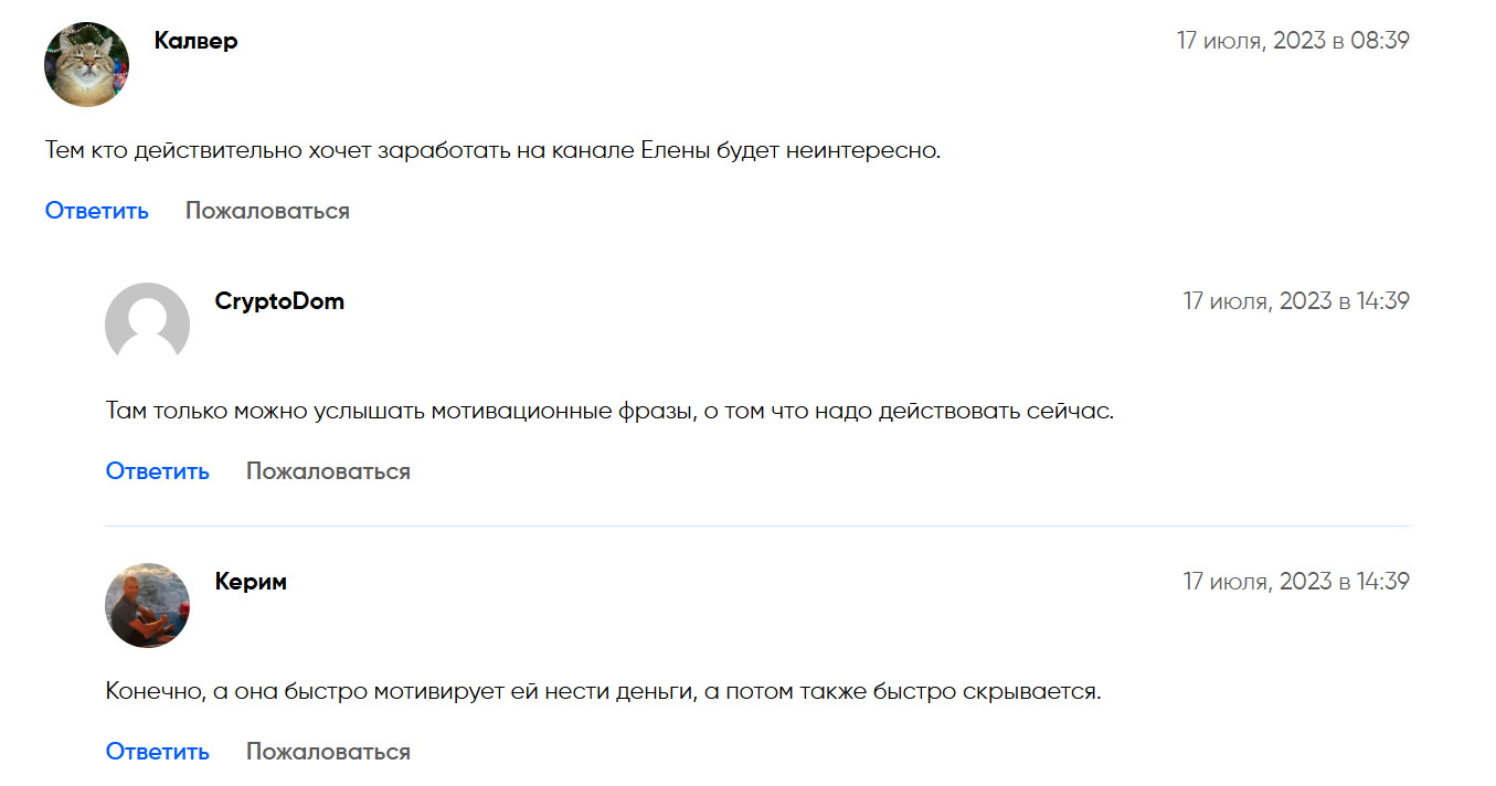 «Твой путь к деньгам с Еленой» — это не путь к деньгам, а путь к пустому кошельку. Обещания увеличить вложения в 100 раз — чистый развод. Фейковые отзывы и липовые скриншоты сделок — классика жанра. Не ведитесь на этот скам!