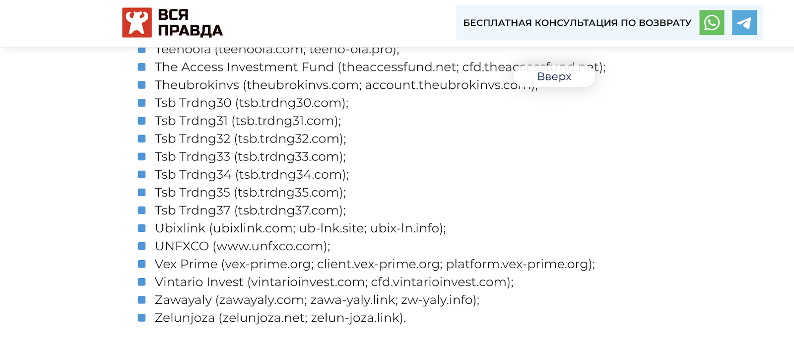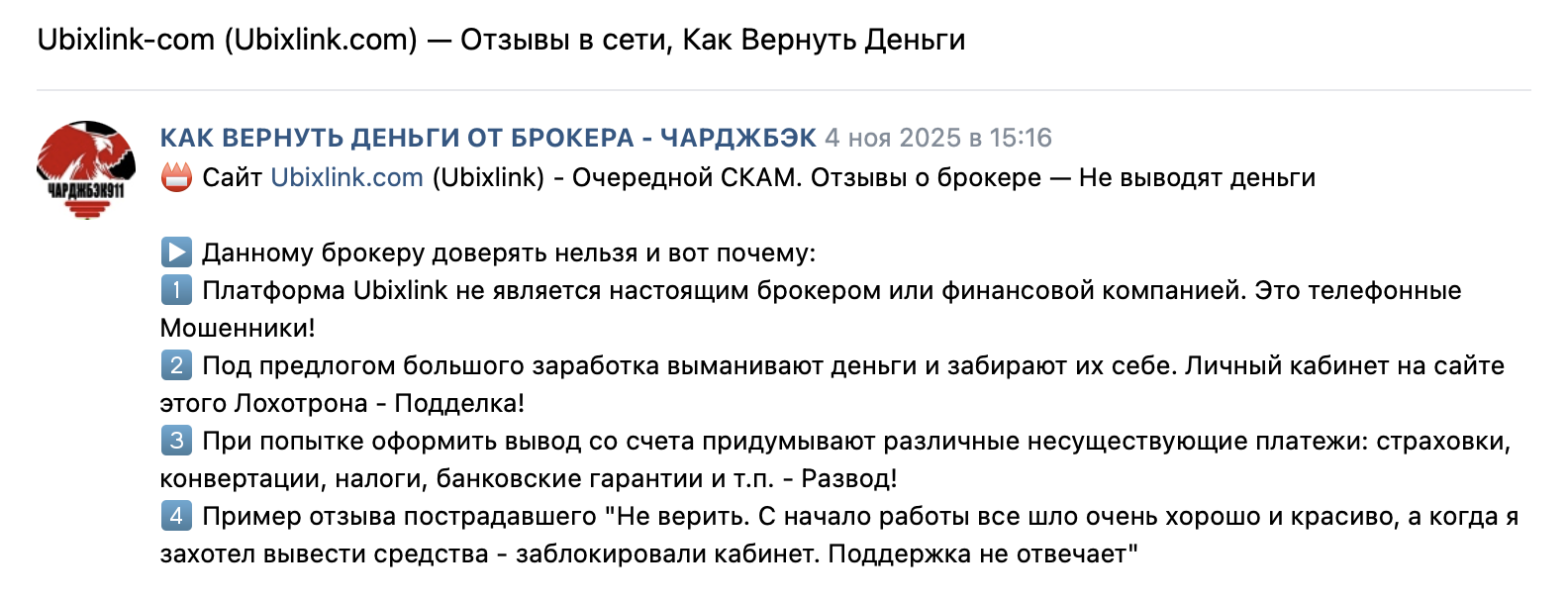 Вдобавок, сигналом к окончательному решению в пользу мошеннической деятельности этого брокера, стал ноябрь 2025 года. В это время авторитетный ресурс «Вся правда» включил «Ubixlink» в реестр недобросовестных фирм, дополнительно указав его домены-двойники.