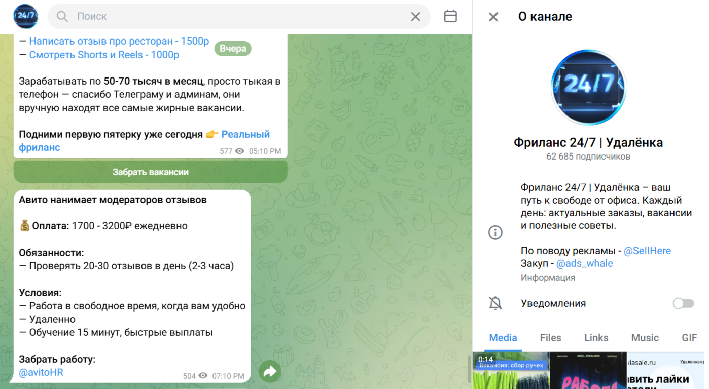 Обзор телеграм-канала «Фриланс 24 7 Удаленка»: отзывы и анализ деятельности проекта SeIIHere и Ads_whale