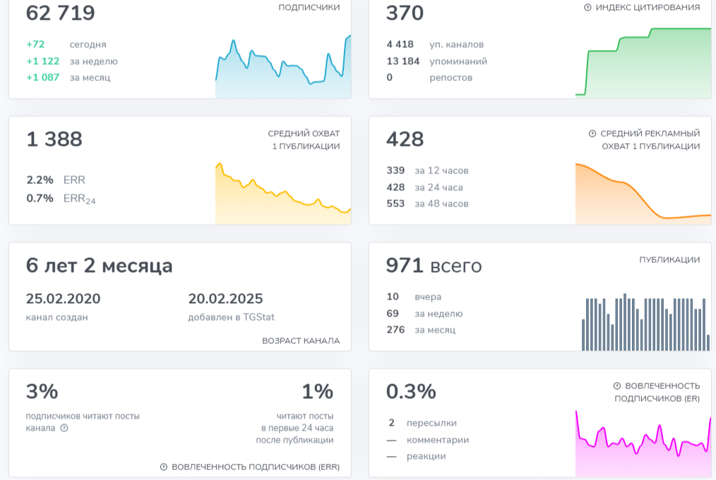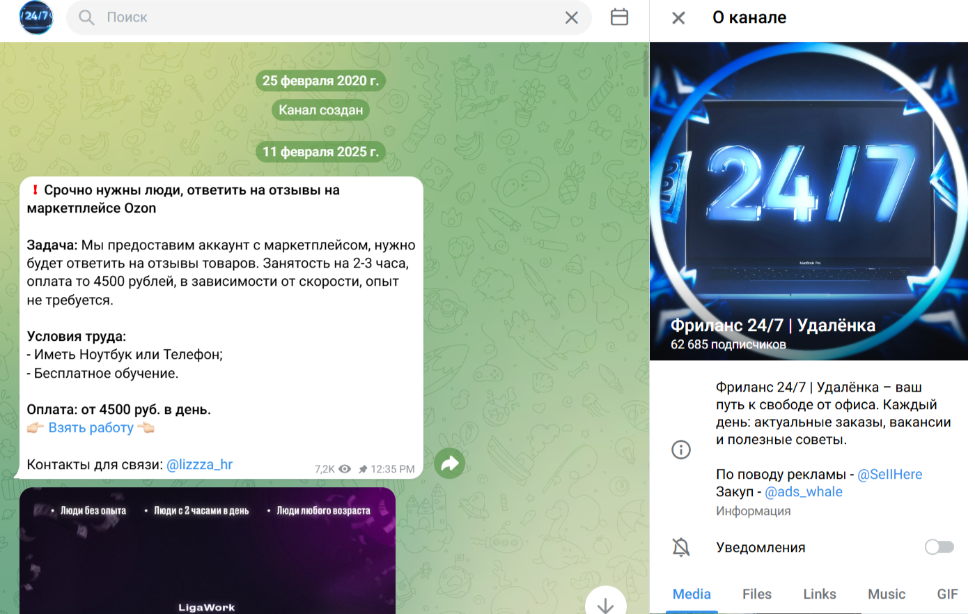 Ресурс в мессенджере появился 25 февраля 2020 года. Платформой для заработка на удаленке он стал лишь 11 февраля 2025 года. На момент обзора телеграм-канал «Фриланс 24 7 Удаленка» имеет 62 000+ подписчиков. За последний месяц их число увеличилось на 1 087 пользователей. Публикации администрации интересны всего 3% аудитории. Перечисленные цифры говорят о явной накрутке ботами и низкой заинтересованности контентом.